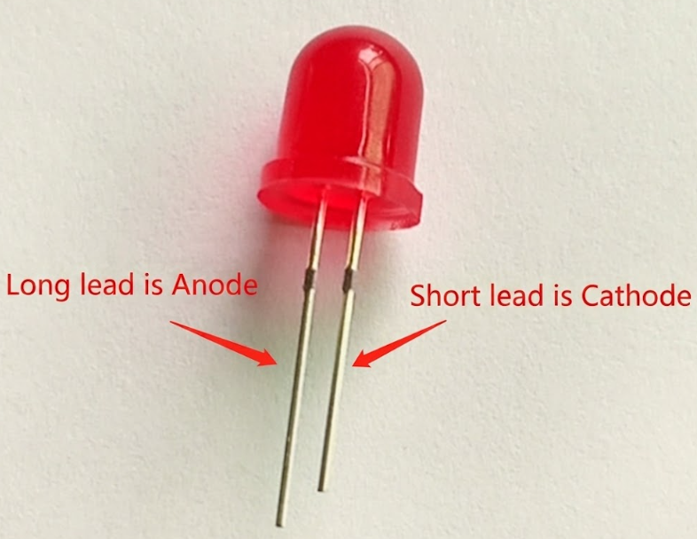 An LED (Light-Emitting Diode) emits light when current flows from its anode (long leg) to cathode (short leg). To prevent damage, always use a current-limiting resistor (typically 1kΩ) in series with the LED. The forward voltage drop is about 1.7V, and the recommended current is 3–20mA.