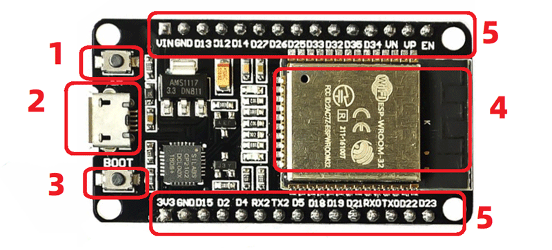 | 3 | BOOT button: Boot mode selection; press for download mode, release for run mode |
